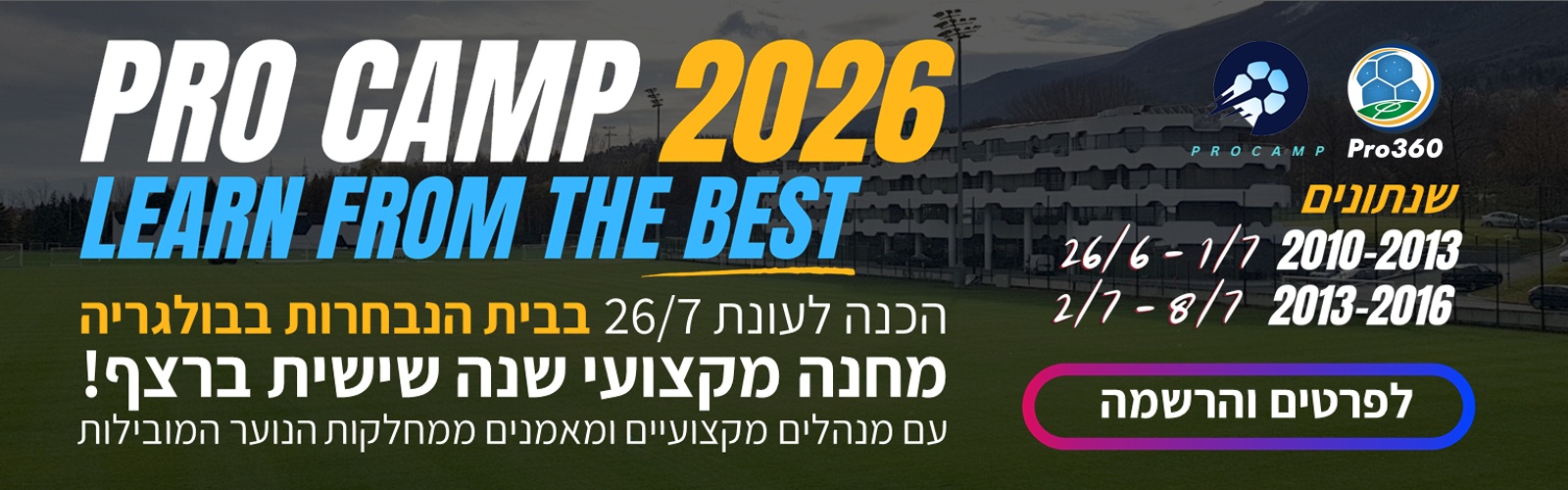 זו השנה השישית ברציפות שמחנה ProCamp מוציא שחקני ליגה למחנה אימונים מקצועי בבולגריה עם צוות מאמנים בכיר, תנאים ברמה בינלאומית וחוויית כדורגל בלתי נשכחת.