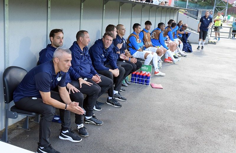 אופיר חיים וצוות המאמנים שאחראיים על ההישג הענק, לא פחות כמו מהשחקנים (Photo by Seb Day – UEFA via Sportsfile)