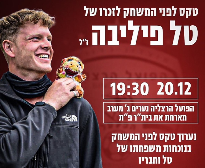 טרם שריקת הפתיחה למשחק נערים ג’ של הפועל הרצליה מערב לבית״ר פ״ת, נערך טקס מרגש לזכרו של טל פיליבה ז״ל, במלאת שנתיים לנופלו בקרב בדרום רצועת עזה. הטקס התקיים בנוכחות בני משפחתו של טל וחבריו, והותיר חותם עמוק על כלל הנוכחים.