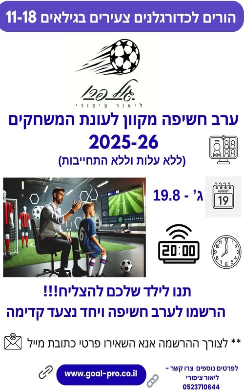 אני, ליאור ציפורי ,אנליסט כדורגל מוסמך ומייסד GOALPRO מזמין אתכם לערב חשיפה מקוון בו אציג את הפרויקט שלי לקידום שחקנים צעירים.